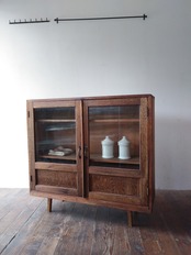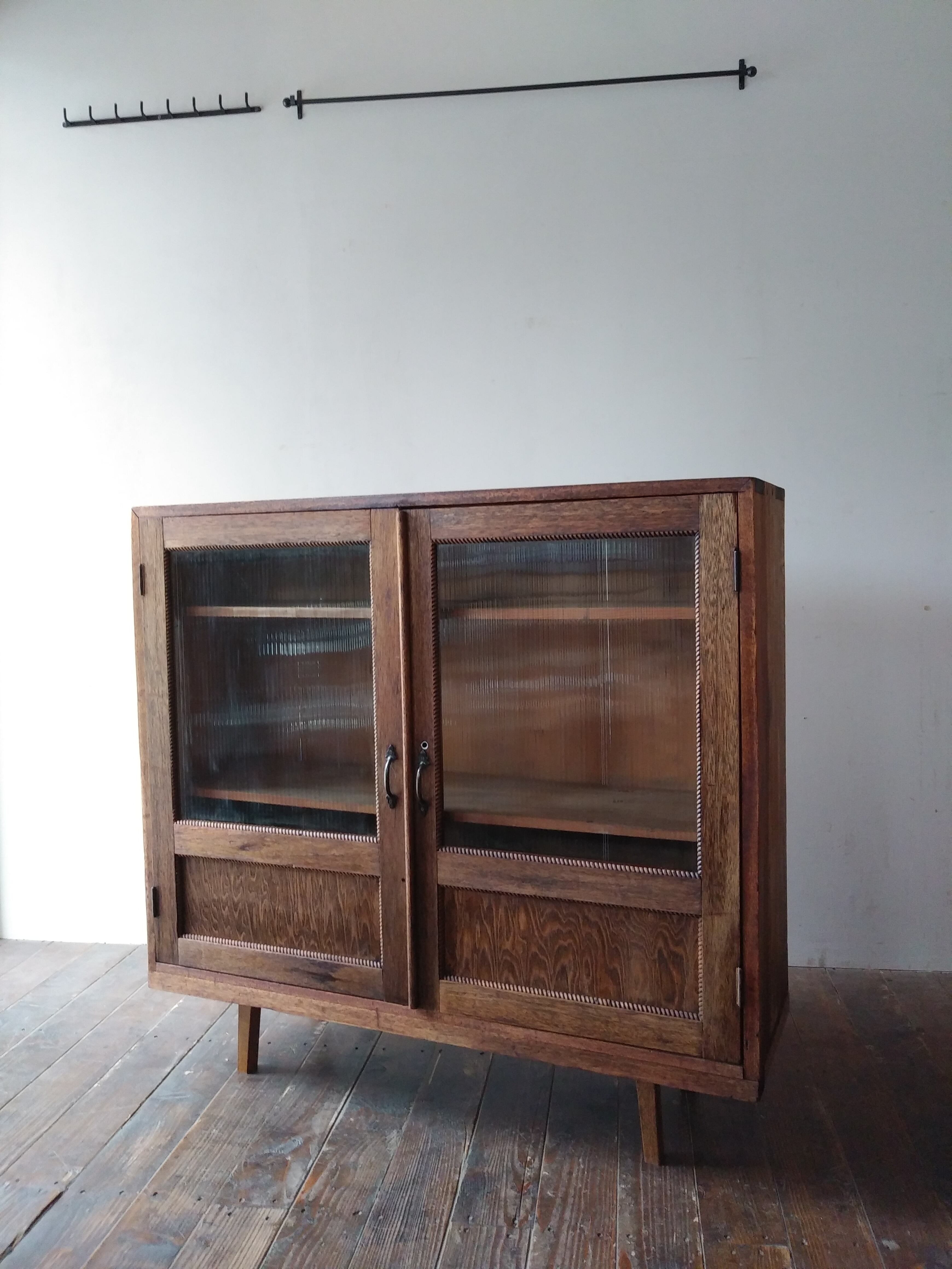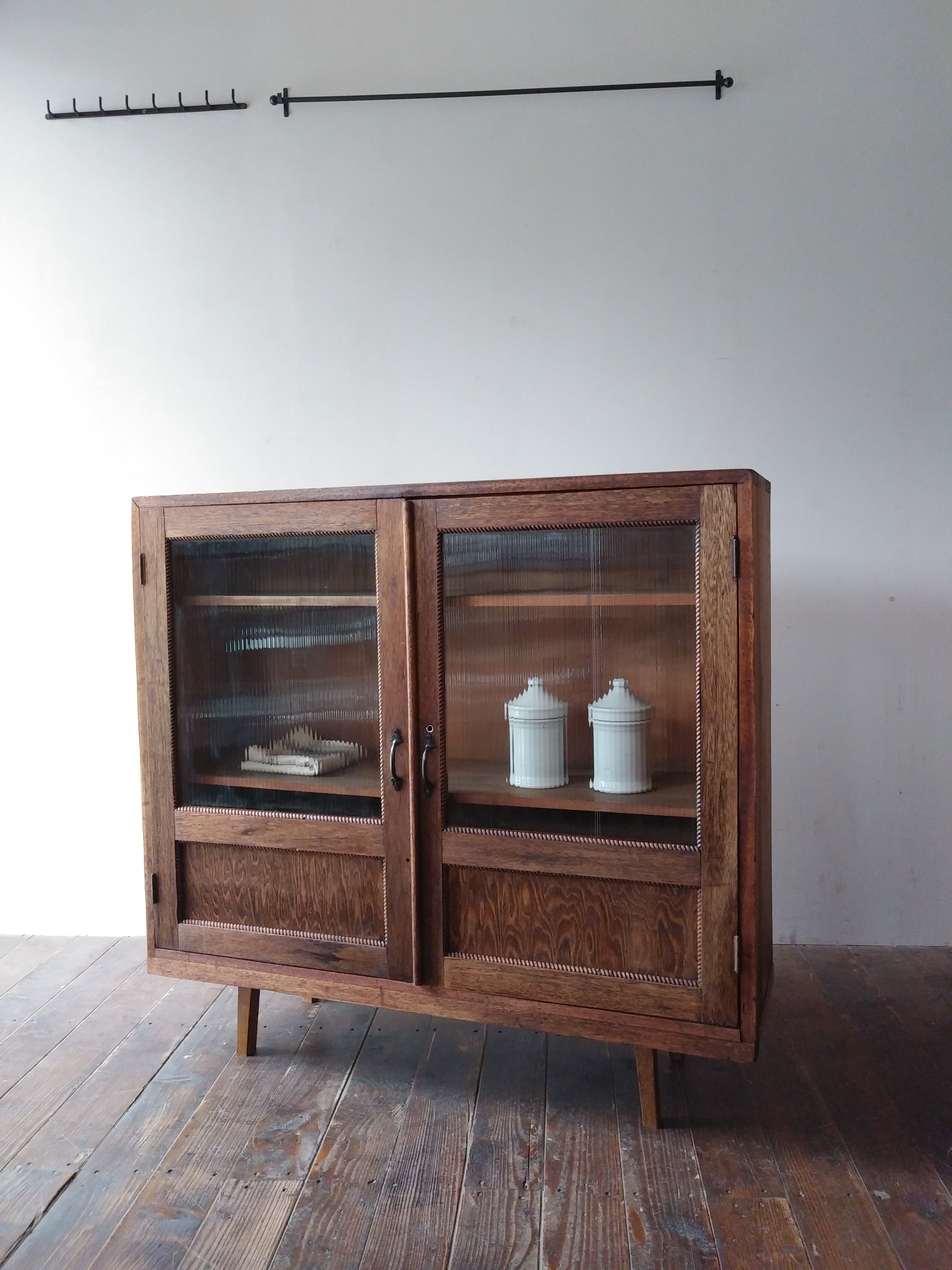 四角い形が印象的な玉飾りのモールガラス戸棚です。